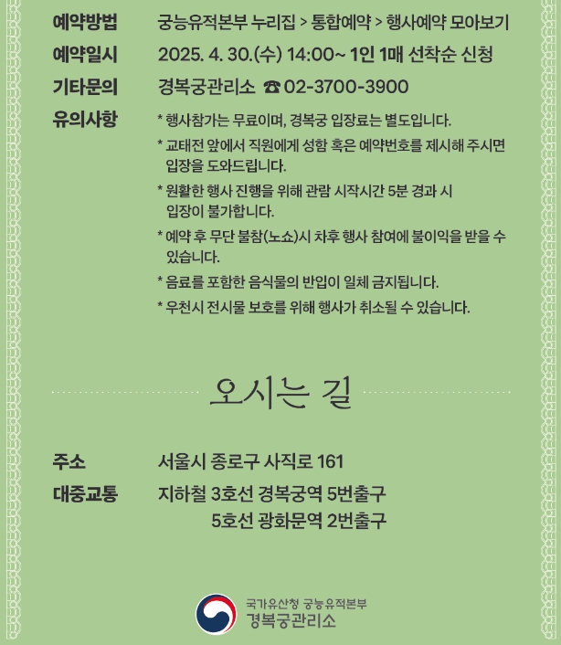 - 관람료: 무료 (단, 경복궁 입장료 별도)