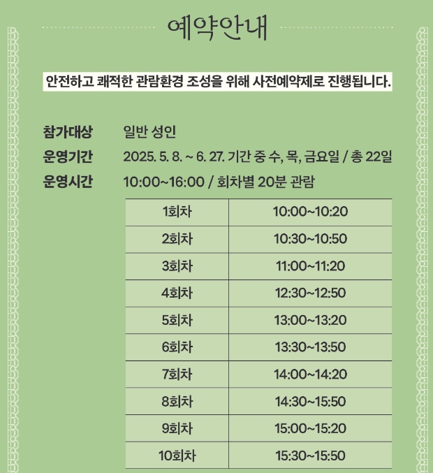 - 관람 시간: 10:00 ~ 16:00 (1일 10회차, 회차당 20분)