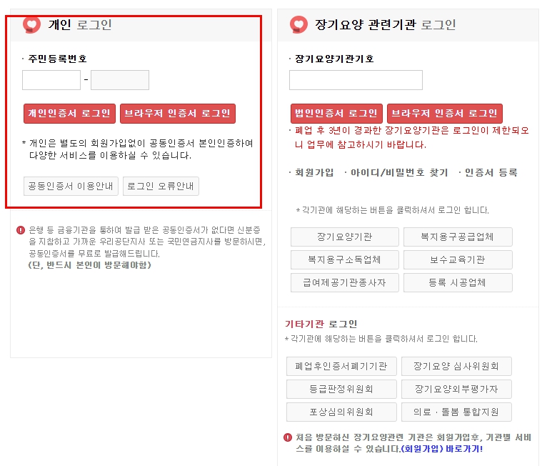 - 국민건강보험공단 홈페이지(https://www.longtermcare.or.kr/)에 접속합니다.