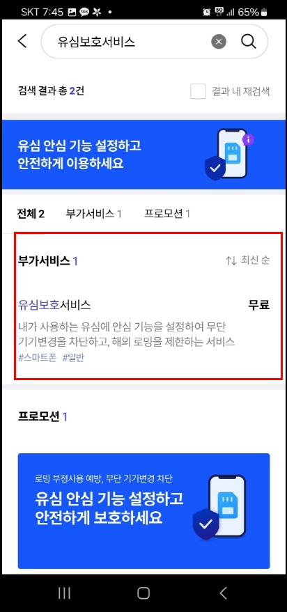 - 검색창에 '유심보호서비스'를 입력하고 해당 페이지로 이동합니다.